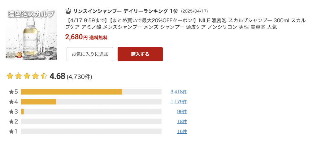 楽天でもレビューは4,730件あり、点数は4.68と高評価です。2025年4月17日現在、楽天市場のリンスインシャンプーでのデイリーランキング1位を獲得しています。