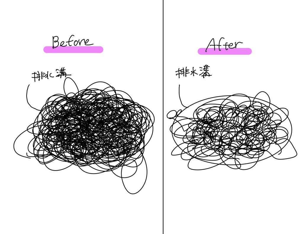 特に感じたのは、お風呂場の排水溝にたまる髪の毛の量が減ったときです。写真は撮っていないので絵で説明するとこんな感じ。明らかに減ってる…!!